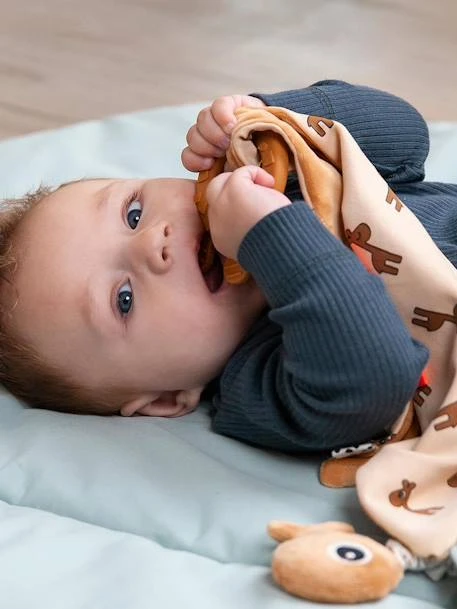 Optez pour cet adorable doudou plat qui offrira du réconfort à bébé et l’accompagnera volontiers au pays des rêves. L’anneau de dentition et ses différentes textures va stimuler et apaiser les gencives de bébé. Il peut être détaché et utilisé indépendamment. Il y a un clip velcro pratique et une boucle élastique pour attacher une sucette. Ce doudou deviendra rapidement