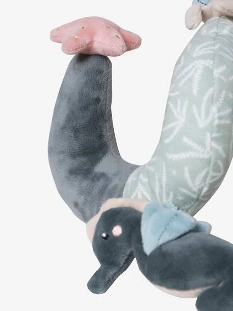 - Sur la spirale, 3 jouets en volume : 1 étoile de mer, 1 tortue, 1 baleine avec pouet pouet et rubans
